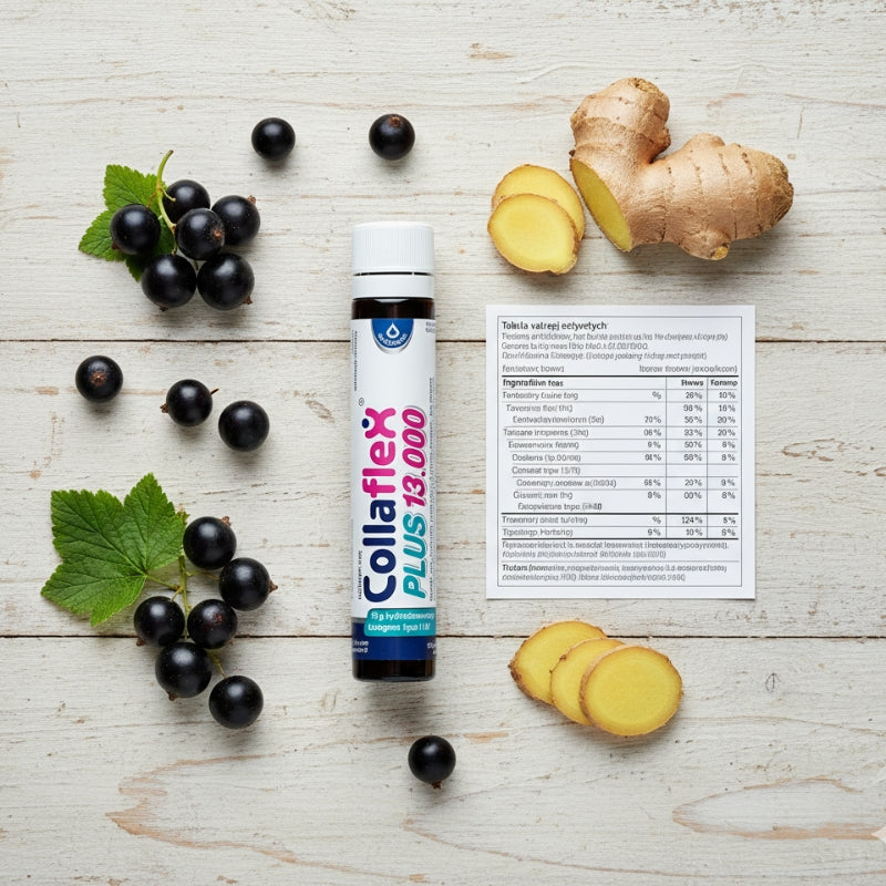 Collaflex Plus 13 000 Shot o smaku porzeczkowym to wysokiej jakości suplement diety w wygodnej formie płynnej (shot 25 ml). Zawiera 13 000 mg hydrolizowanego kolagenu typu I i III – najwyższą zawartość kolagenu na rynku wśród preparatów płynnych. Preparat wzbogacony jest witaminą C (100% RWS) i ekstraktem z kłącza imbiru, które wspierają produkcję kolagenu i vitalność organizmu.