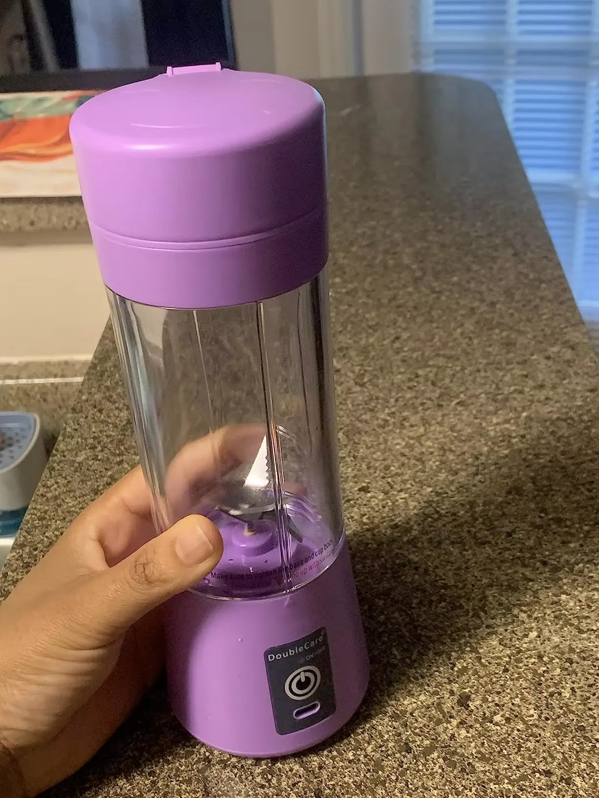 "OMG, ten przenośny kubek do smoothie to ratunek! Używam go każdego ranka do mojego śniadaniowego smoothie. Uwielbiam, że mogę pić prosto z niego i nie muszę myć kolejnego kubka. Bateria wystarcza na moją rutynę 3 razy dziennie. Tak wygodny i stylowy! Dałam go mojej siostrze, ona też go uwielbia!"